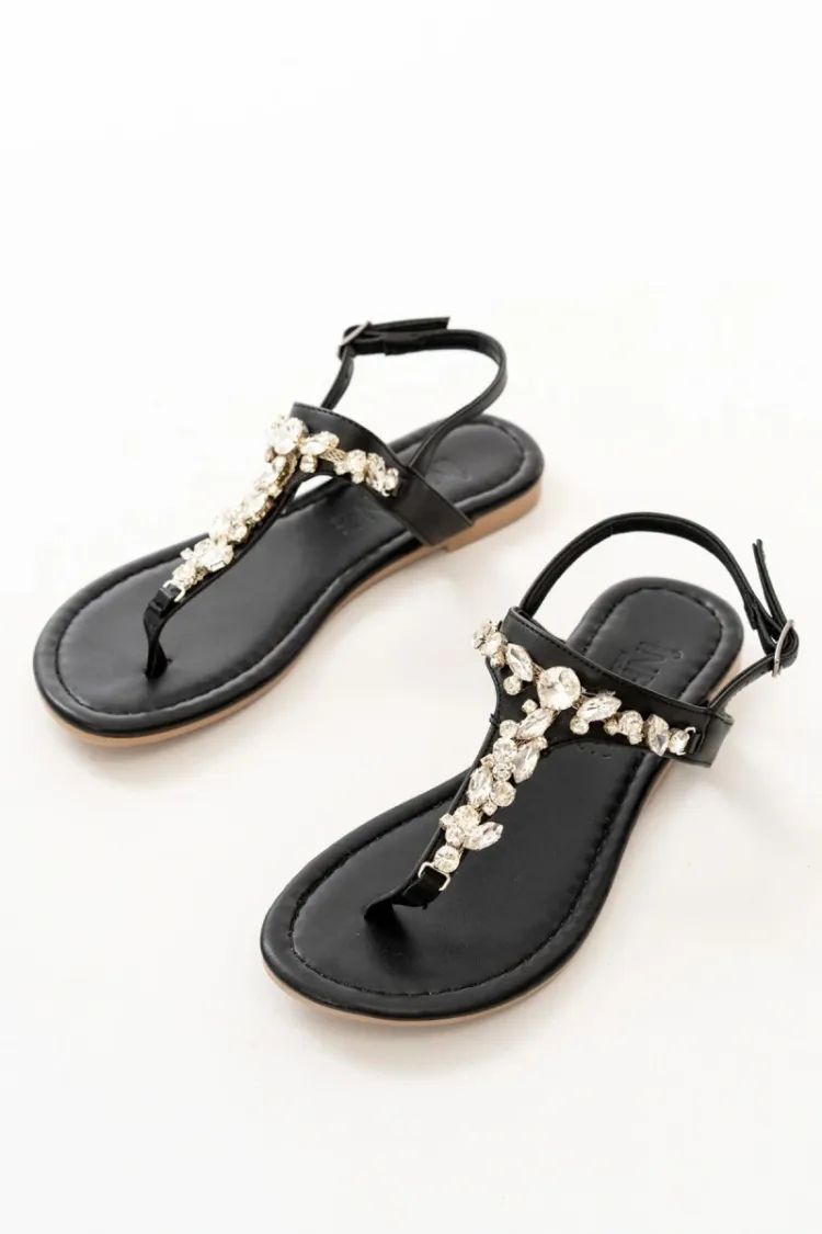 Yaz akşamlarının ışıltısını adımlarınıza taşıyın. Klasik parmak arası tasarımını göz alıcı gümüş taş detaylarıyla buluşturan bu sandalet, hem plaj şıklığında hem de yazlık davetlerde en büyük yardımcınız olacak. Siyahın asaleti ve taşların parıltısı, konforlu taban yapısıyla birleşerek size gün boyu süren bir şıklık vaat ediyor.
