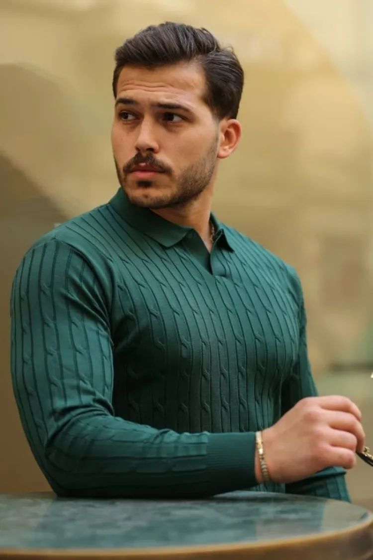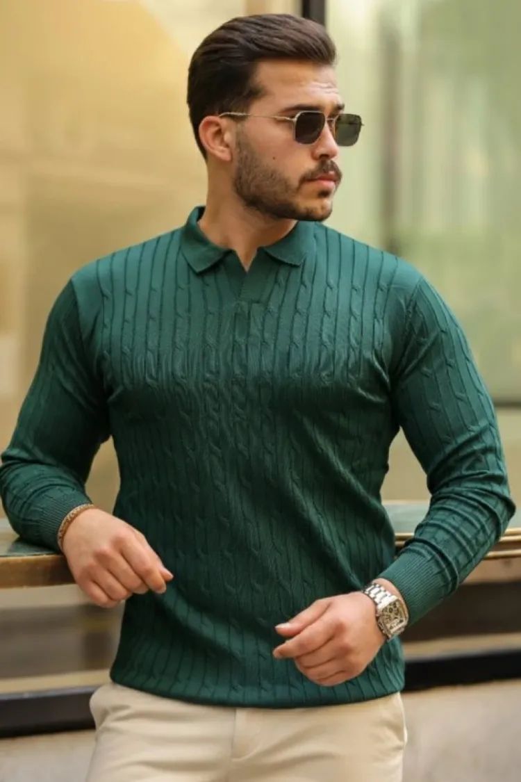 Erkek Saç Örgü Desen Uzun Kollu Triko - Yeşil