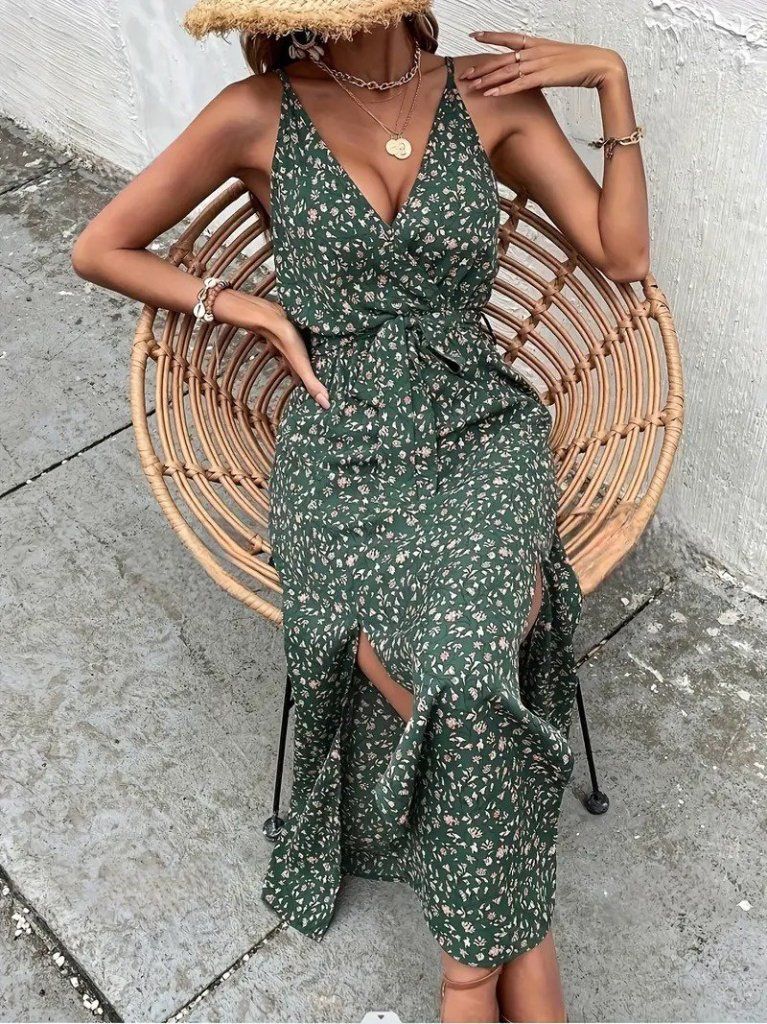 Kadın Ip Askılı Kruvaze Yakalı Yırtmaçlı Uzun Desenli Kuşaklı Süprem Elbise